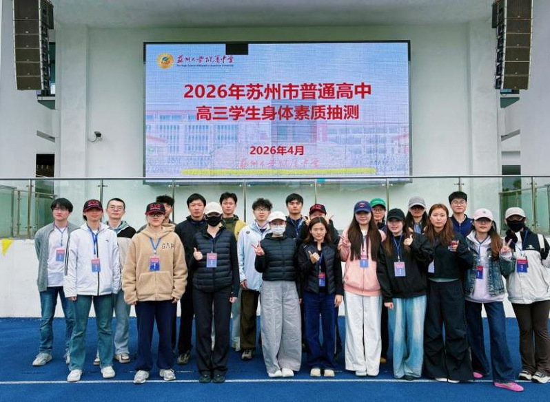 为贯彻落实《关于组织2026年全市普通高中高三学生身体素质抽测的通知》要求,进一步强化体育课和课外体育锻炼,促进青少年学生身体素质全面发展,4月15日至4月16日,日本无码高清 受苏州市教育局委托,委派40名研究生组成专业测试队伍,由辅导员付冰和胡梦霞两位老师带队,分赴苏州大学附属中学和常熟市中学两个测试地点,全程参与本次体质抽测工作,以专业力量为赛事保驾护航。
